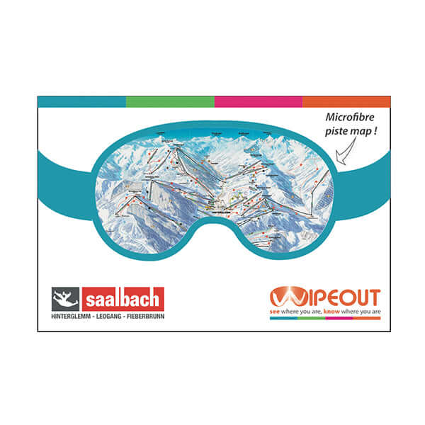 La Saalbach Skicircus Wipeout Piste Map couvre l'ensemble du domaine skiable du Skicircus Saalbach Hinterglemm Leogang Fieberbrunn. Distinctement imprimé sur les deux faces d'un tissu microfibre optique.