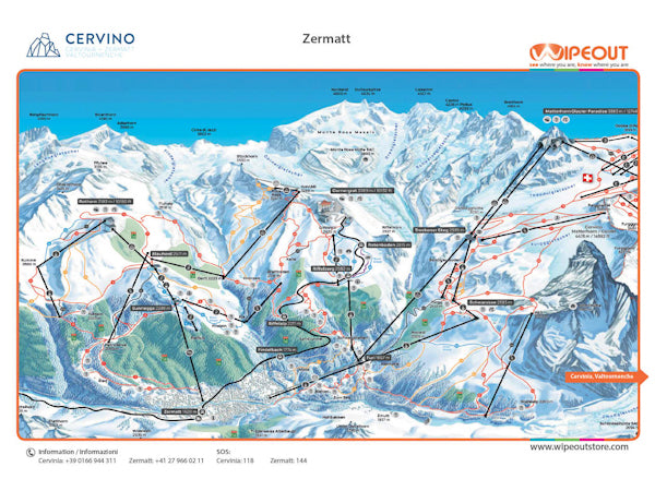 Le plan des pistes de Zermatt Cervinia Wipeout est le plan des pistes officiel et le plus récent de la station obtenu directement du domaine skiable. La zone de sports d'hiver est située entre les altitudes de 1 562 et 3 899 m.