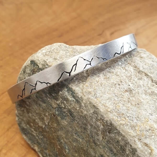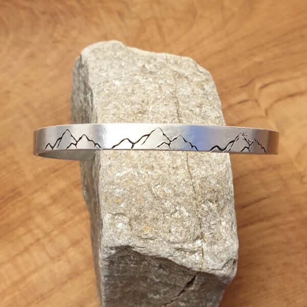 This Aluminium cuff bracelet is a wonderful gift for mountain lovers with the words, “The Mountains Are Calling" hand-stamped on the inside.