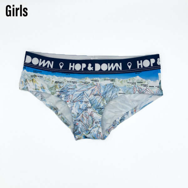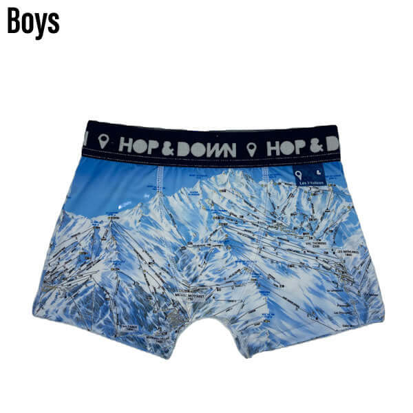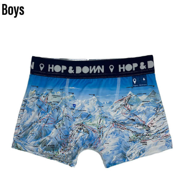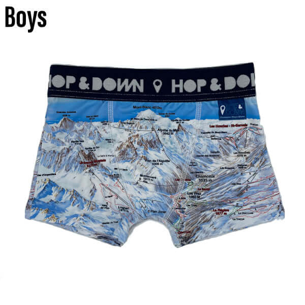 Our collection of piste map pants & boxer shorts for boys and girls from Hop & Down©. Fantastic fun and a wonderful way to take the mountains with you wherever you go!