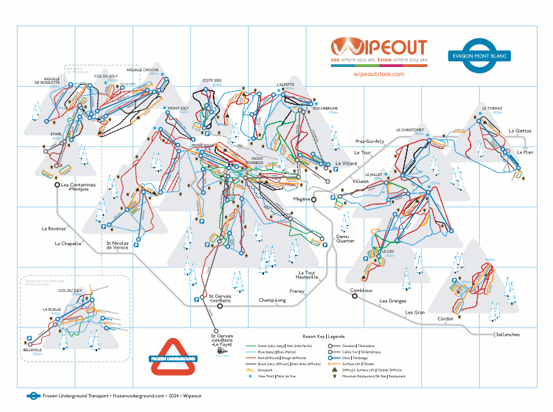 This map has been created in the style of the London Underground map. It covers from St Gervais including the new VALLEEN telecabine from le Fayet and all the Megeve pistes. Navigate with ease due to the beautiful simplicity of the map style