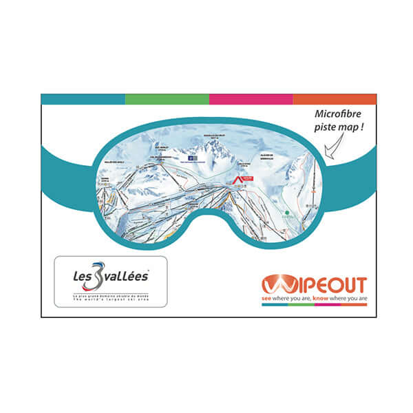 A Wipeout Piste Map is 30x40cm in size, printed double-sided on microfibre lens cloth and comes neatly packed in a paper pouch with a goggle-shaped window!